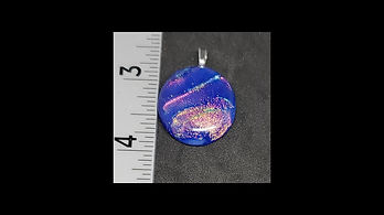 This was part of a larger piece. I used a blue and white streaky glass for the base and a textured dichroic on top. I cut into several pieces and fused again. Finished with a silver bail.